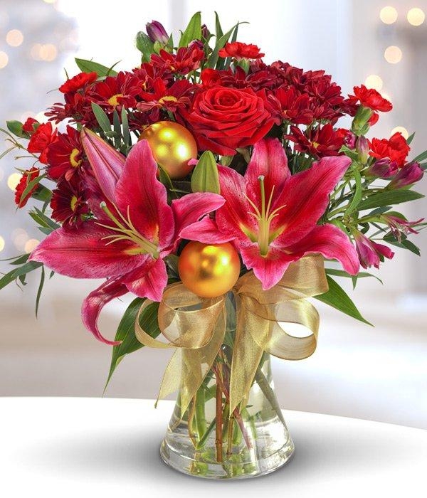 This joyful arrangement brings together the best of Christmas tradition. Bursting with red Roses, Chrysanthemums, Carnations, and pink Lilies, it’s finished with a flourish of cerise Alstroemeria and golden baubles—radiating warmth, cheer, and festive sparkle.