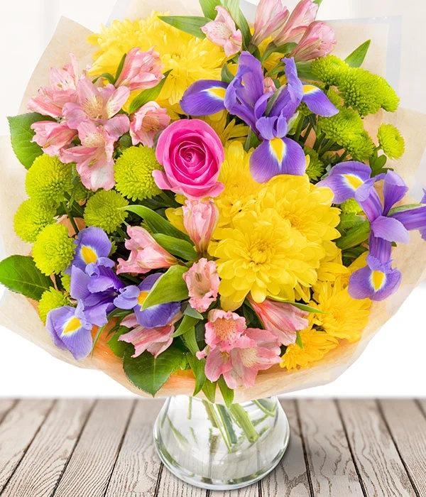 A cheerful bouquet to brighten anyone’s day, Spring Hedgerow combines soft pinks and sunny yellows. Featuring a beautiful pink rose, vibrant iris, and delicate alstroemeria, it’s the perfect arrangement for springtime celebrations.